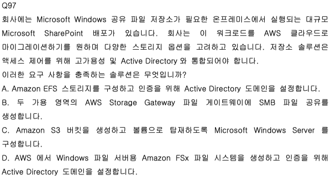 즉, “Windows 공유 파일(SMB) + 고가용성 + AD 통합”을 만족하는 AWS 스토리지를 고르는 문제다.