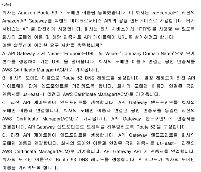 C. 리전 API Gateway 엔드포인트(커스텀 도메인) 생성 → 회사 도메인 연결 → 동일 리전(ca-central-1) ACM에 인증서 가져오기 → API Gateway 엔드포인트에 인증서 연결 → Route 53에서 해당 엔드포인트로 트래픽 라우팅