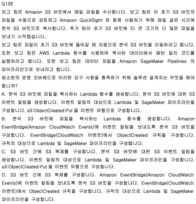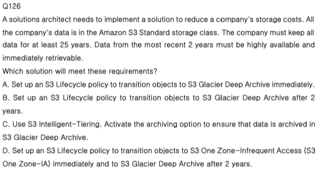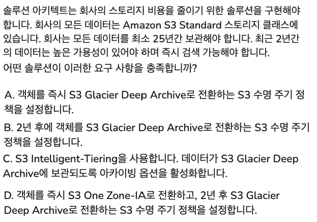 → “1개월 초과 로그를 Deep Archive로”는 S3 수명 주기 정책(B) 이 적절함.