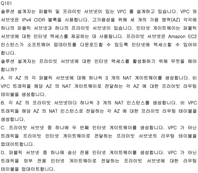 즉, “프라이빗 서브넷에서 아웃바운드 인터넷만 허용”하면서 3 AZ 고가용성을 유지하는 구성을 고르는 문제다.