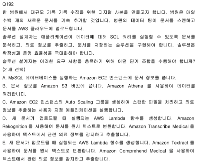 E. 새 문서 업로드 시 Lambda 실행 + Textract(문서→텍스트) + Comprehend Medical(텍스트→의료 정보)