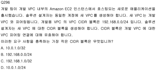 D. 10.0.1.0 ~ 10.0.1.255로, 192.168.0.0/24와 겹치지 않고, /24는 VPC 허용 범위이며, 제시된 보기 중 유일하게 “유효한 새 VPC CIDR” → 정답