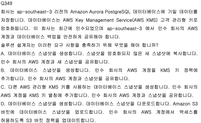 동작: 크로스 계정으로 스냅샷을 공유하면, 인수 회사는 스냅샷을 보지만 복호화하려면 해당 KMS 키 사용 권한이 필요함 → 키 정책에 인수 회사 계정 추가가 필수