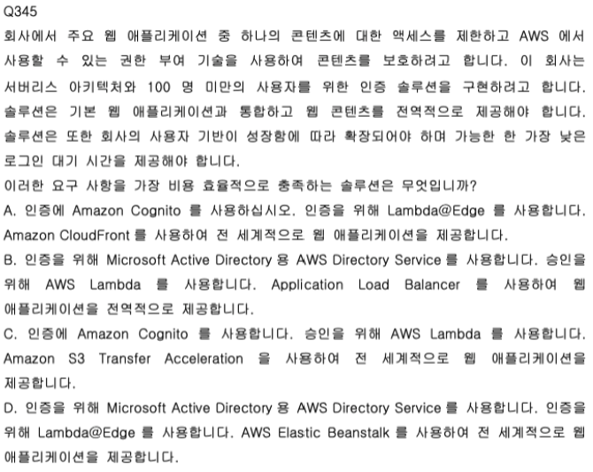 인증: Cognito = 관리형 사용자 풀, 서버리스, 100명 미만에 비용 효율적, 저지연