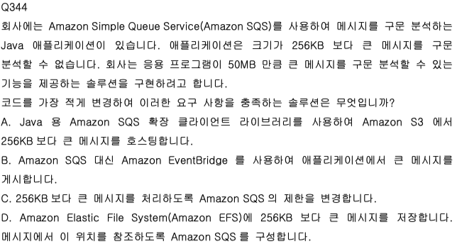 코드 변경 최소: 표준 SQS 클라이언트를 Extended Client로 교체 + S3 버킷 설정만 하면 됨 → “코드를 가장 적게 변경” 충족