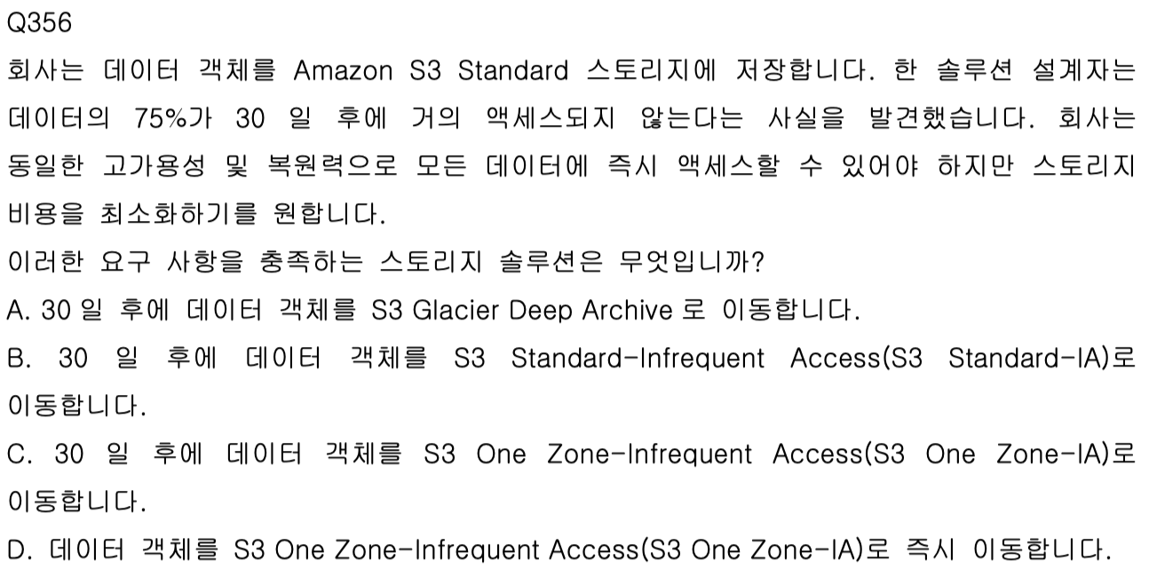→ 30일 후 저활용 데이터를 저렴한 스토리지 클래스로 옮기되, 즉시 액세스 + Standard와 같은 고가용·복원력(멀티 AZ) 이어야 함.