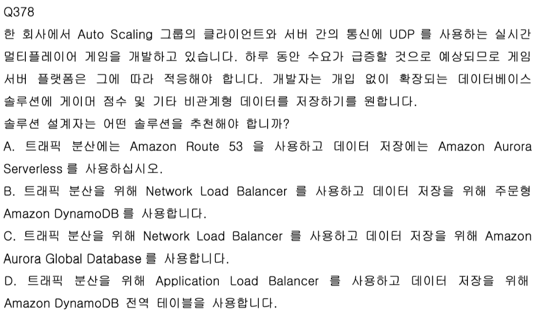 일반 UDP 트래픽을 위한 “UDP 활성화” 옵션이 없고, 게임용 UDP 프로토콜 지원 대상이 아님 → UDP 게임 트래픽에는 Global Accelerator(B) 가 맞음