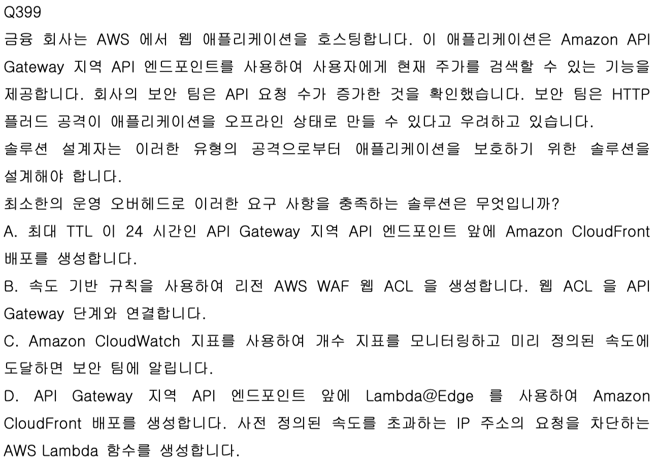 A. CloudFront + 24시간 TTL은 캐싱으로 API로 가는 요청 수를 줄이는 효과는 있지만, HTTP 플러드 자체를 차단하는 기능은 없습니다. 캐시가 안 되는 요청(실시간 주가 등)에는 효과가 제한적이고, “플러드 공격으로부터 보호”라는 요구를 직접적으로 충족하지 못합니다.