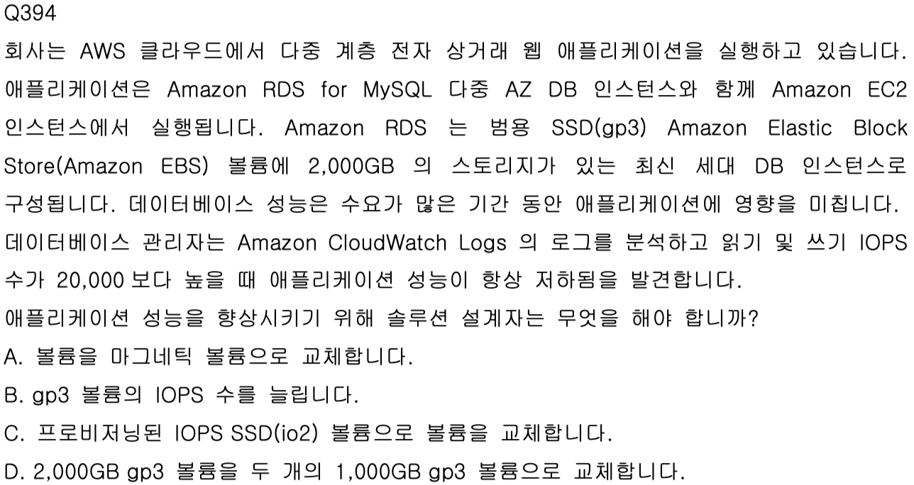 C. io2(프로비저닝된 IOPS SSD) 로 바꾸면 볼륨당 64,000 IOPS 등 더 높은 IOPS를 낼 수 있어 기술적으로는 가능합니다. 하지만 정답이 D인 경우, 시험에서는 “동일 gp3를 유지하면서 볼륨 수를 늘려 집계 IOPS 용량을 키우는 것(D)”을 더 적절한 해법으로 보는 것으로 보입니다. (비용·구성 복잡도 등에서 D를 선호하는 관점일 수 있습니다.)