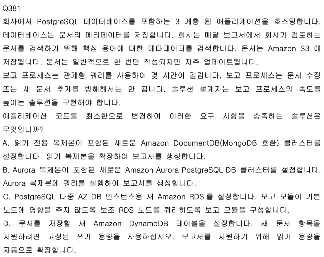 문제: 수요가 많을 때 DB 성능이 앱에 영향. CloudWatch 로그 분석 결과 읽기·쓰기 IOPS가 20,000을 넘으면 항상 성능 저하