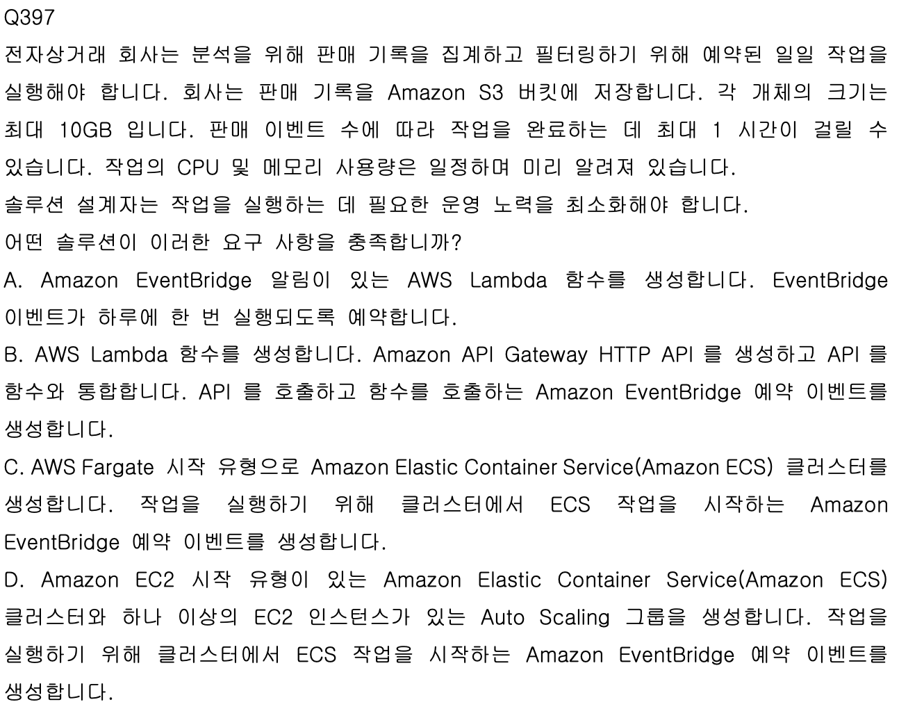 B. Lambda + API Gateway + EventBridge로 호출하는 구성도, Lambda 15분 제한과 대용량 객체 처리 제한은 그대로라 A와 같은 이유로 부적절합니다.